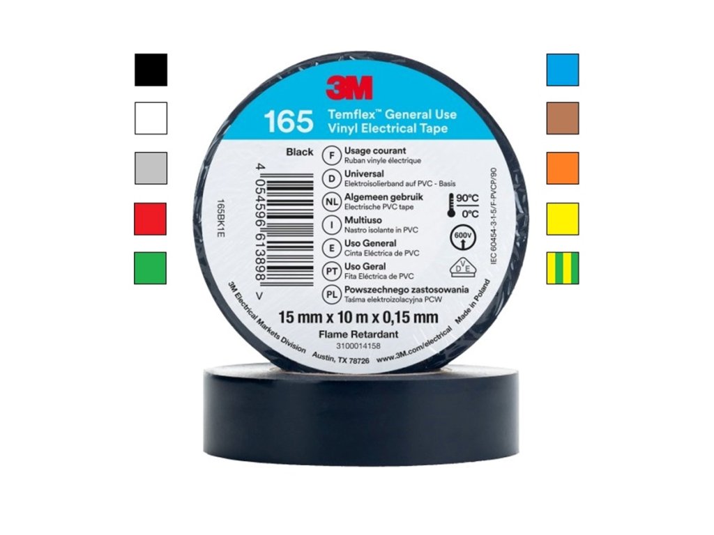 Kvalitní izolační páska 3M Temflex 165 s vysokou elektrickou pevností a odolností vůči vlhkosti, kyselinám a slunečnímu záření. Ideální pro elektroinstalace a opravy kabelů.